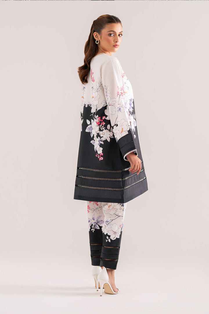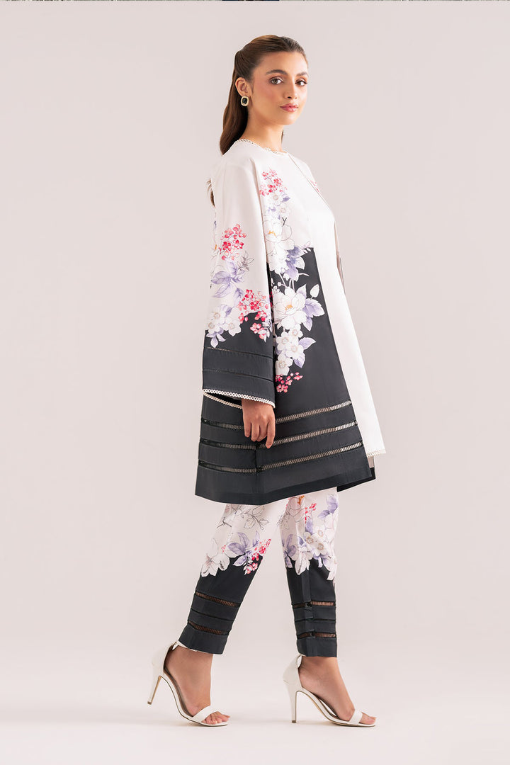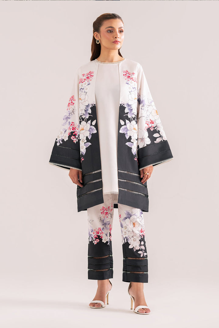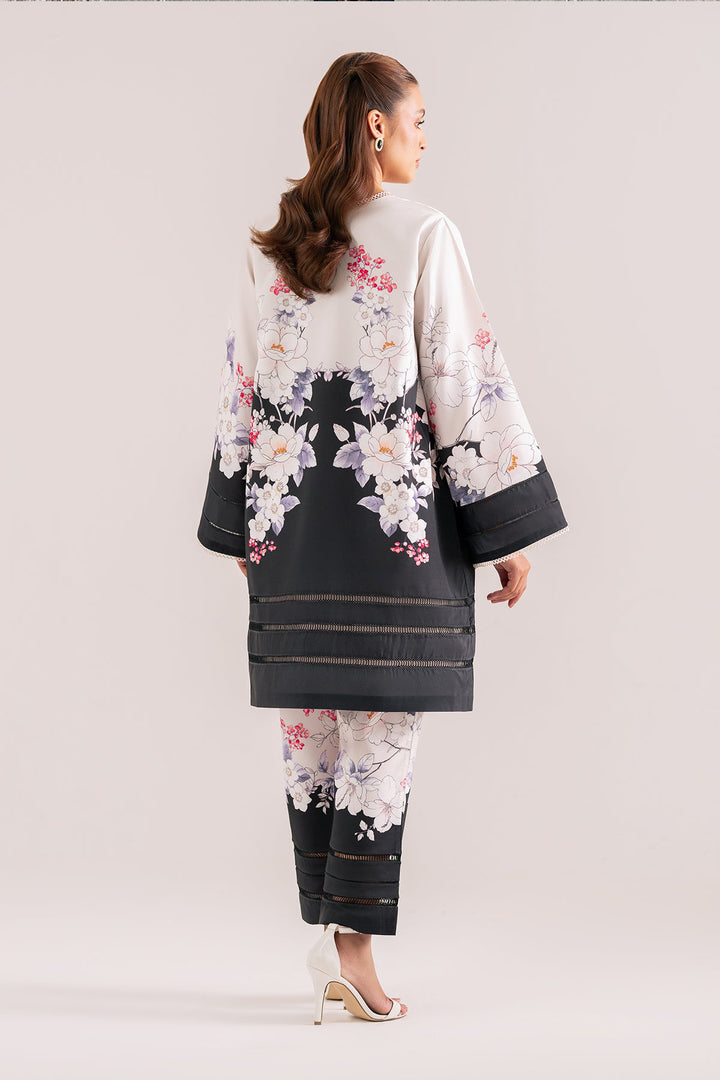This ready-to-wear co-ord set features a white and black printed design in premium Pakistani rayon satin. It includes a comfortable palazzo bottom, combining style and ease for a polished look.