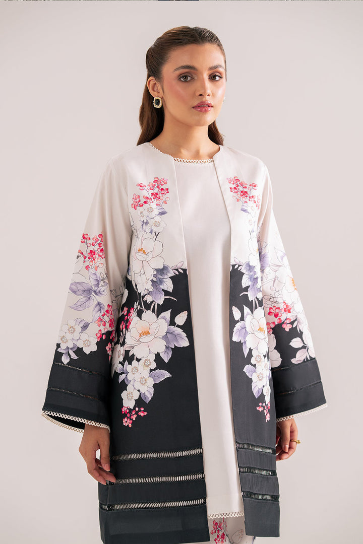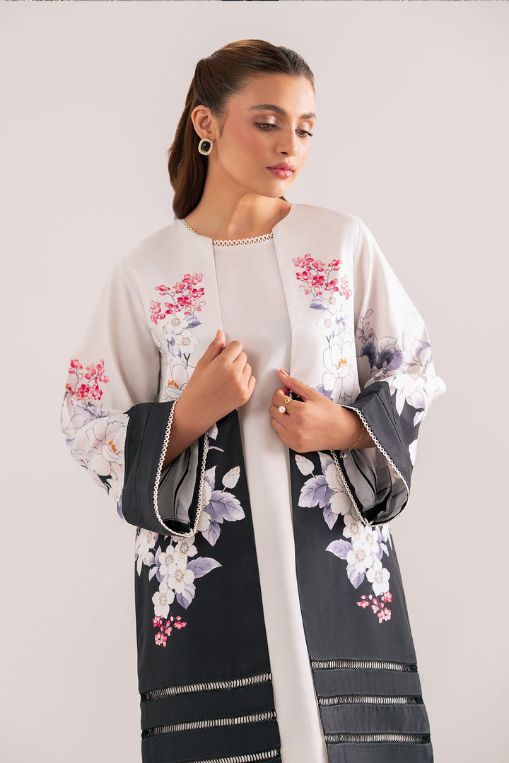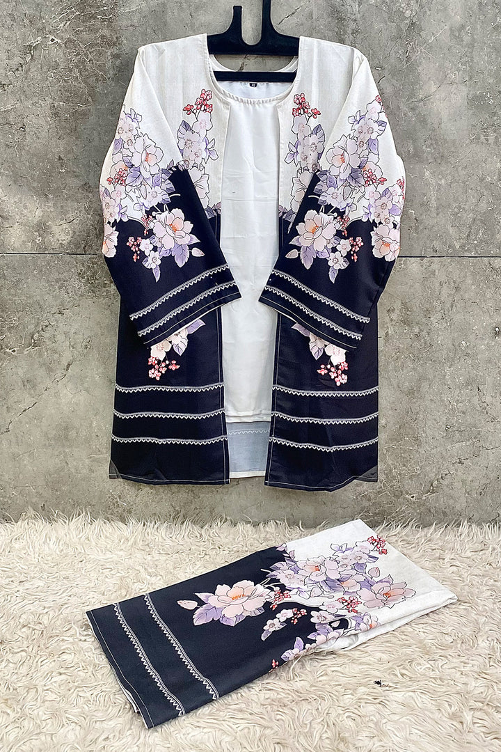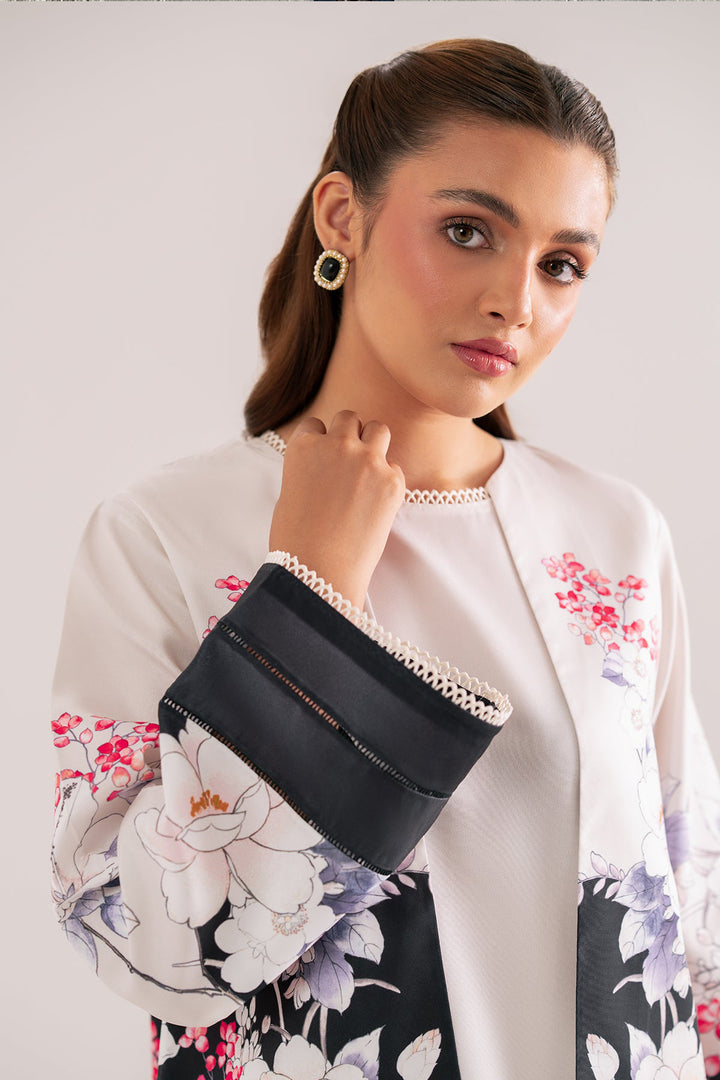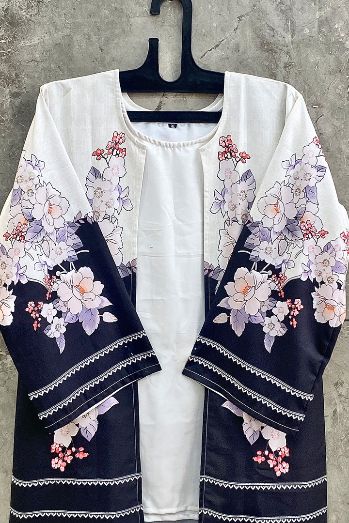 This ready-to-wear co-ord set features a white and black printed design in premium Pakistani rayon satin. It includes a comfortable palazzo bottom, combining style and ease for a polished look.